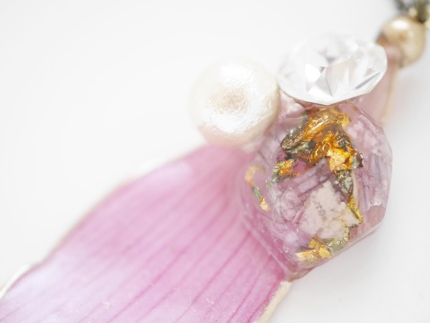 スワロフスキーと蓮の花びらをそっと閉じ込めたパーツが、キラキラと輝き、上品な華やかさをプラスしてくれています。